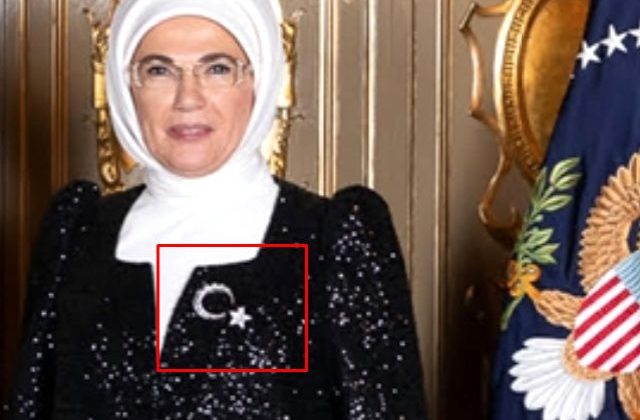 Cumhurbaşkanı Erdoğan’ın eşi Emine Erdoğan yemek için siyah bir elbise tercih etti. First Lady’nin siyah elbisesinin üstüne taktığı Ay-Yıldızlı broş gözlerden kaçmadı.