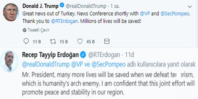 Erdoğan, Twitter’dan Trump’a verdiği yanıtta, “Sayın Başkan, insanlığın baş düşmanı terörizmi yendiğimizde daha fazla can kurtarılacak. Bu ortak çabanın bölgemizde barışı ve istikrarı destekleyeceğinden eminim.” paylaşımında bulundu.
