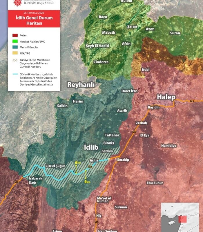 25 Temmuz 2020 tarihi itibarıyla İdlib genel durumu ile Türk-Rus ortak devriyesinin ulaştığı noktayı, gerçekleşen devriye güzergahını gösteren harita;