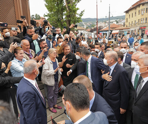 Erdoğan, Kovaçi Şehitliği’nde Bosna Hersek’in ilk Cumhurbaşkanı Aliya İzzetbegoviç’in kabrini ziyaretinin ardından “Saraybosna’nın kalbi” olarak nitelendirilen Başçarşı Meydanı’na geldi. Erdoğan burada kendisine sevgi gösterisinde bulunan vatandaşları selamladı.