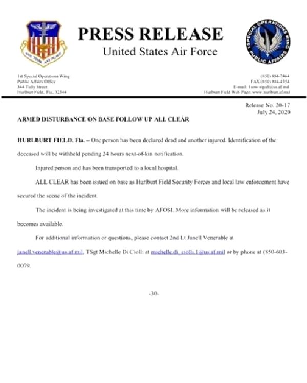 Amerika Birleşik Devletleri Hava Kuvvetleri Hurlburt Field üssünde çıkan kavga silahlı çatışmaya dönüştü. Çatışmada, bir kişi öldü ve bir kişi ise yaralandı.