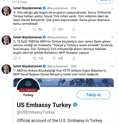 MHP Genel Sekreteri ve Bursa Milletvekili İsmet Büyükataman Twitter hesabından yaptığı bir dizi paylaşımda ABD Büyükelçiliğine şu sözlerle tepki gösterdi: