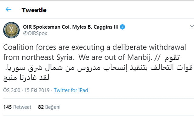 ABD öncülüğündeki DEAŞ karşıtı koalisyon sözcüsü Myles B. Caggins, koalisyon güçlerinin Münbiç’ten çekildiğini açıkladı. Sözcü Caggins gelişmeyi Twitter hesabı üzerinden paylaştığı notla duyurdu.
