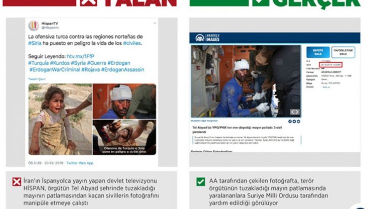 Türkiye’nin güney sınırında oluşturulmaya çalışılan terör koridorunu yok etmek, bölgeye barış ve huzur getirmek amacıyla başlatılan Barış Pınarı Harekatı aleyhine manipülasyon çabalarında, İran’ın İspanyolca yayın yapan devlet televizyonu HİSPAN, örgütün Tel Abyad şehrinde tuzakladığı mayının patlamasından kaçan sivillerin fotoğrafını çarpıtmaya çalıştı.