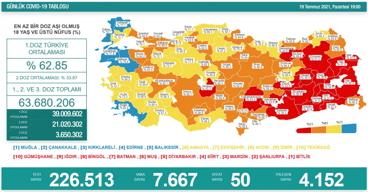 Son 24 saatte 226 bin 513 test yapıldı, 7 bin 667 yeni vaka tespit edildi. 50 kişi de koronavirüs nedeniyle hayatını kaybetti.