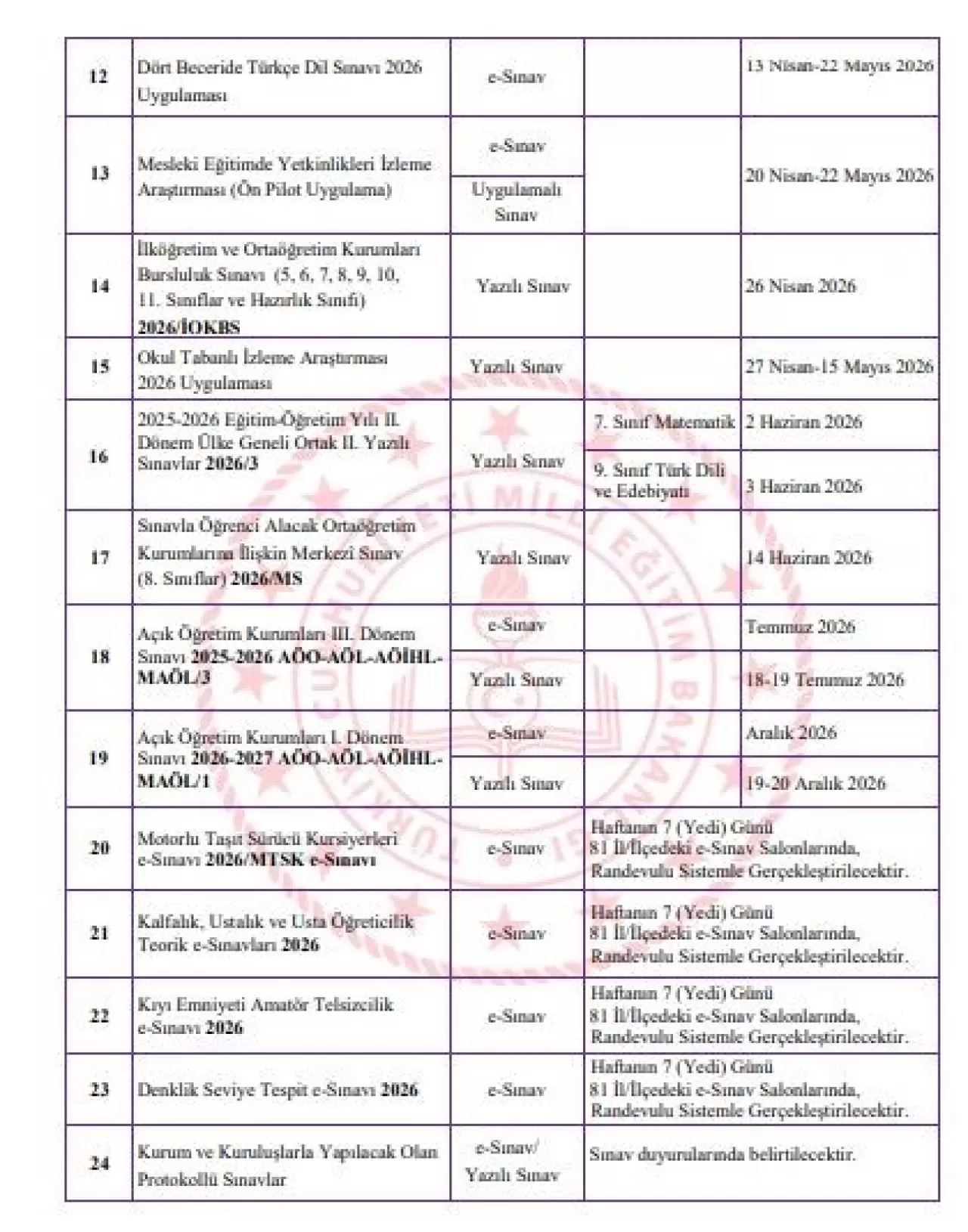 Ayrıca takvimde; gerçekleştirilecek Açık Öğretim Kurumları Sınavları, izleme araştırmaları ile e-Sınav merkezlerinde yapılacak sınavların tarihlerine de yer verildi.