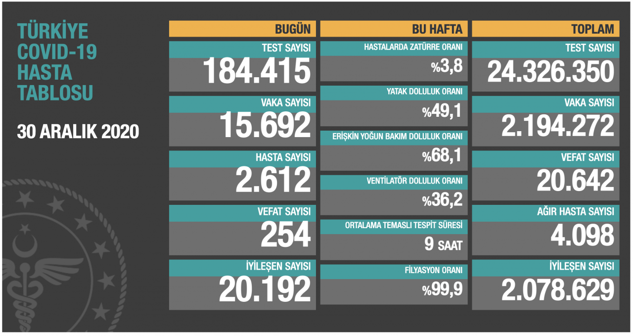 Türkiye’de son 24 saatte 184 bin 415 Kovid-19 testi yapıldı, 15 bin 692 kişinin testi pozitif çıktı, 254 kişi hayatını kaybetti.