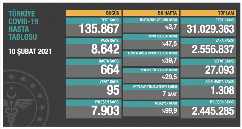 Test sayısı 31 milyon 29 bin 363’e ulaştı. Vaka sayısı 2 milyon 556 bin 837, vefat sayısı 27 bin 93, ağır hasta sayısı 1308 oldu.