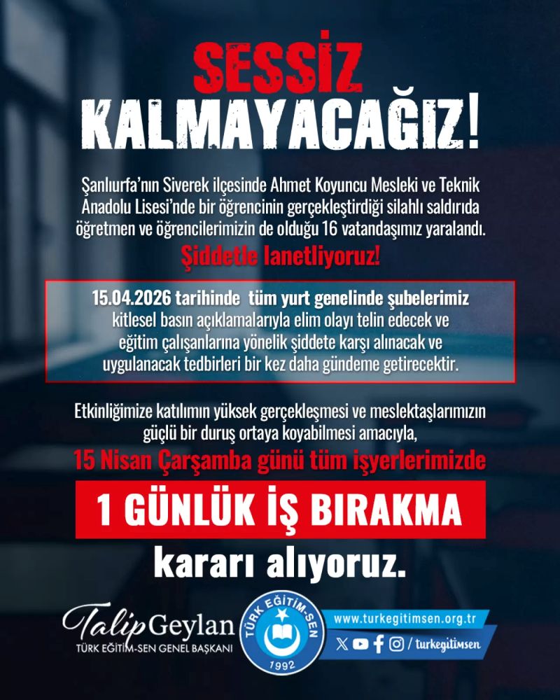 Türk Eğitim-Sen’den Siverek’teki Saldırı Sonrası Yeni Karar: Eğitimciler İş Bırakıyor!