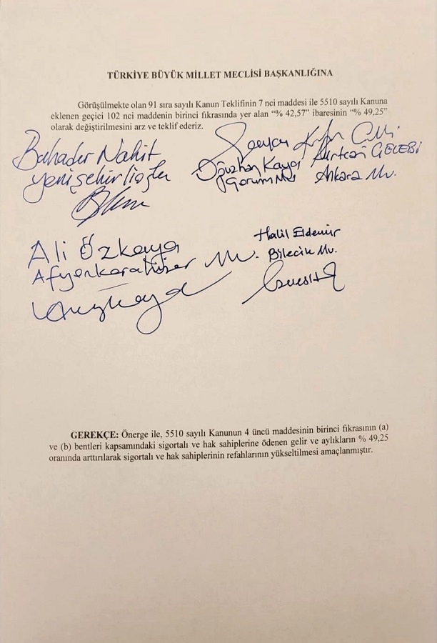 Önergeyle, Meclis Genel Kurulunda görüşülmekte olan ‘İşsizlik Sigortası Kanunu ile Bazı Kanunlarda Değişiklik Yapılmasına Dair Kanun Teklifi’nin 7’nci maddesi ile 5510 Saylı Kanun’a eklenen geçici 102’nci maddenin birinci fıkrasında yer alan ‘yüzde 42,57’ ibaresinin ‘yüzde 49,25’ olarak değiştirilmesi teklif edildi.