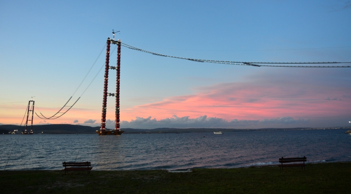 Hizmete girdiğinde “dünyanın en büyük orta açıklıklı asma köprüsü” unvanını alacak, renkleri, figürleri ve diğer özellikleriyle özgün mimariye sahip 1915 Çanakkale Köprüsü’nün inşası sürüyor.