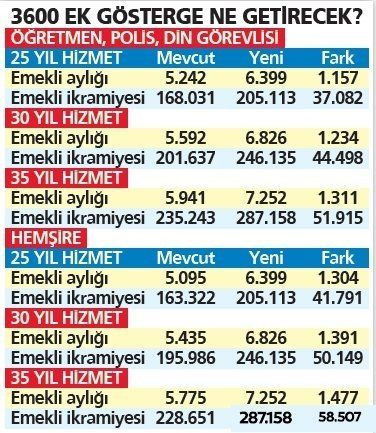 Hizmet süresi 25 yıl olan polis, öğretmen ve din görevlisinin emekli aylığı bin 157, hizmet süresi 35 yıl olanlarınki ise bin 311 lira yükselirken, hemşirelerde artış 25 yıl hizmeti olanlarda bin 304 ve 30 yıl hizmeti bulunanlarda bin 477 lirayı bulacak.