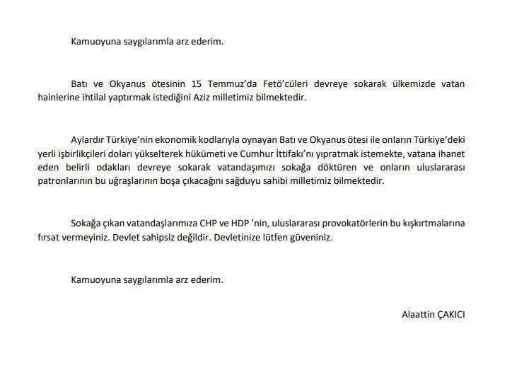 Alaattin ÇAKICI: Provokatörlerin kışkırtmalarına fırsat vermeyiniz Devletinize güvenin