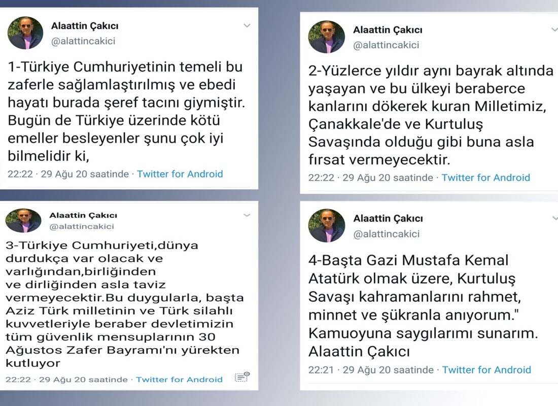 Çakıcı kendi sosyal medya hesabı olan Twitter’da paylaştığı 30 Ağustos Zafer Bayramı nedeni ile mesajında ;