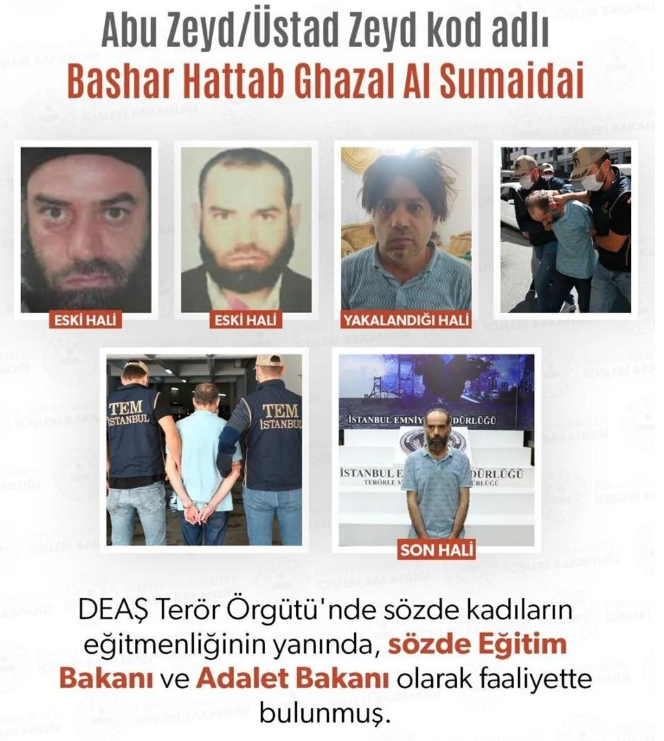 Cumhurbaşkanı Recep Tayyip Erdoğan, DAEŞ terör örgütünün en önemli üst düzey yöneticilerinden biri olan “Abu Zeyd/Üstad Zeyd” kod adlı terörist Bashar Hattab Ghazal Al Sumaidai’nin Türk güvenlik güçlerince Türkiye’de yakalandığını açıkladı.