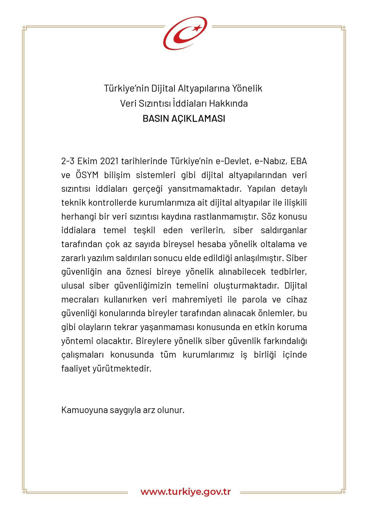 Açıklamada, “2-3 Ekim 2021 tarihlerinde Türkiye’nin e-Devlet, e-Nabız, EBA ve ÖSYM bilişim sistemleri gibi dijital altyapılardan veri sızıntısı iddiaları gerçeği yansıtmamaktadır” denildi.