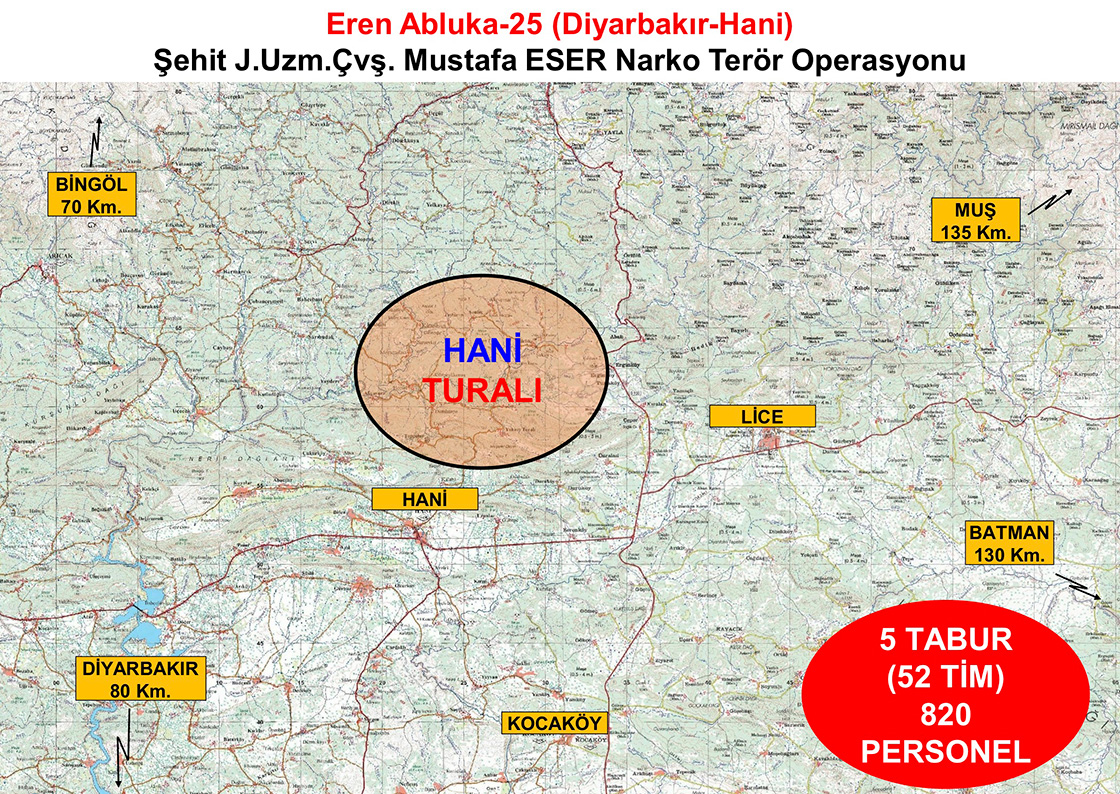 Operasyonun ilk gününde, Diyarbakır İl Jandarma Komutanlığınca Diyarbakır’ın Hani ilçesi Turalı Mahallesi kırsalında 50 ayrı nokta tespit edildi.