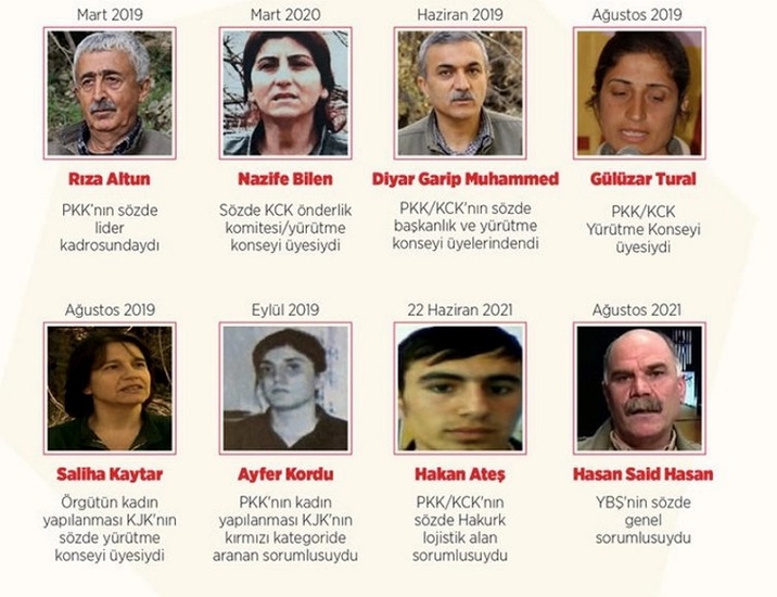TSK ve MİT’in son 5 yılda SİHA ile Suriye ve Irak’ta gerçekleştirdiği operasyonlarda etkisiz hale getirilen, örgütün beyin takımı arasında yer alan ve İçişleri Bakanlığı tarafından 10 milyon lira para ödüllü kırmızı kategorisinde aranan o teröristler;