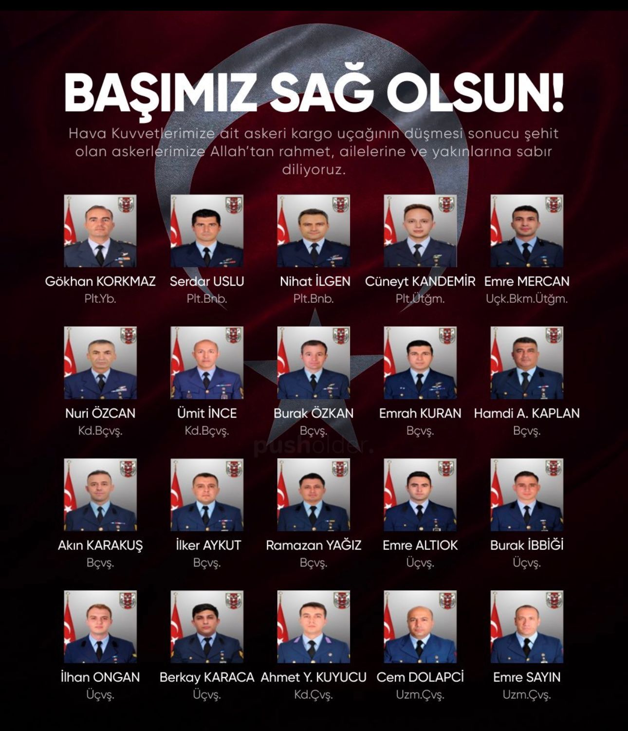 Azerbaycan-Gürcistan sınırına düşen C-130 kargo uçağında 20 asker şehit oldu. Cenazeleri askeri törenlerle Türkiye’ye getirilen şehitler, Ankara, Kayseri, Eskişehir ve Kocaeli’de yüzlerce kişinin katılımıyla son yolculuklarına uğurlanıyor.