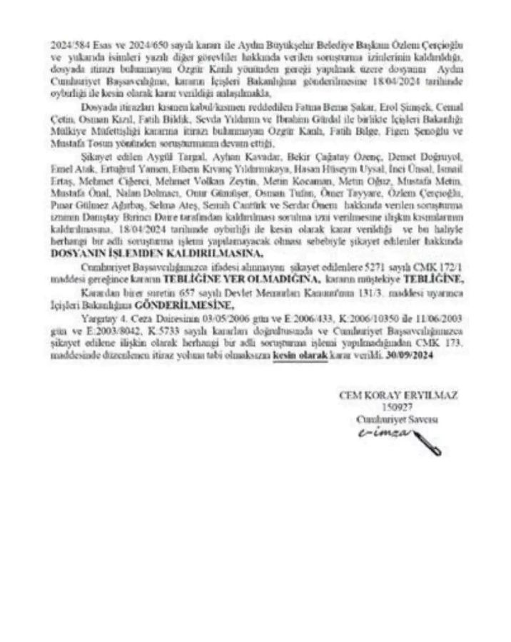 Ayrıca Özel’in gündeme getirdiği JANTSA ve Aziz İhsan Aktaş ile ilgili iddiaları reddeden Çerçioğlu, Danıştay ve Aydın Cumhuriyet Başsavcılığı kararlarının yer aldığı resmi belgeleri de kamuoyuyla paylaştı.