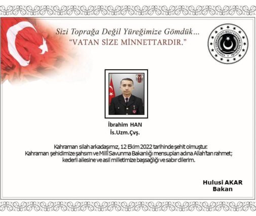 MSB’den yapılan yazılı açıklamada, “Pençe-Kilit Harekatı bölgesinde 12 Ekim 2022 tarihinde bölücü terör örgütü mensuplarınca yerleştirilen EYP’nin patlaması sonucu yaralanarak hastaneye sevk edilen kahraman silah arkadaşımız İs.Uzm.Çvş. İbrahim Han, yapılan tüm müdahalelere rağmen kurtarılamayarak şehit olmuştur. Bizleri derin bir acı ve üzüntüye boğan bu olayda hayatını kaybeden aziz şehidimize Allah’tan rahmet, kederli ailesine, Türk Silahlı Kuvvetleri ile asil milletimize başsağlığı ve sabır dileriz” ifadelerine yer verdi.