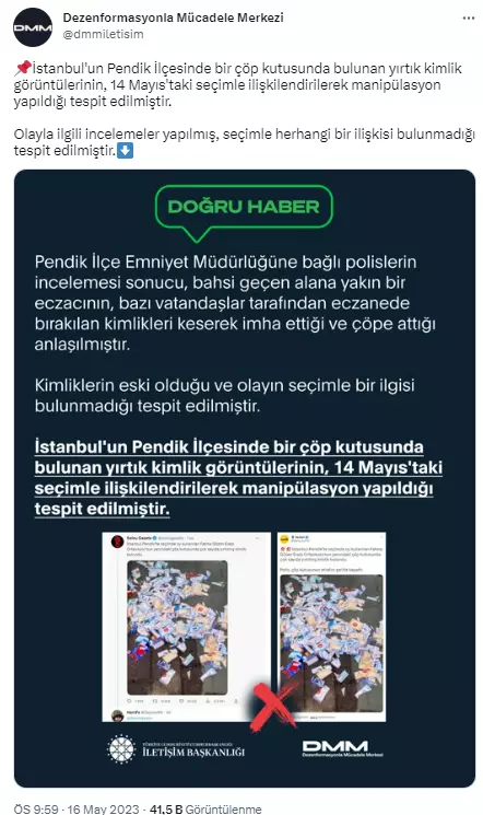 Cumhurbaşkanlığı İletişim Başkanlığı Dezenformasyonla Mücadele Merkezi’nden konuyla ilgili yapılan açıklamada, “İstanbul’un Pendik İlçesinde bir çöp kutusunda bulunan yırtık kimlik görüntülerinin, 14 Mayıs’taki seçimle ilişkilendirilerek manipülasyon yapıldığı tespit edilmiştir. Olayla ilgili incelemeler yapılmış, seçimle herhangi bir ilişkisi bulunmadığı tespit edilmiştir” denildi.