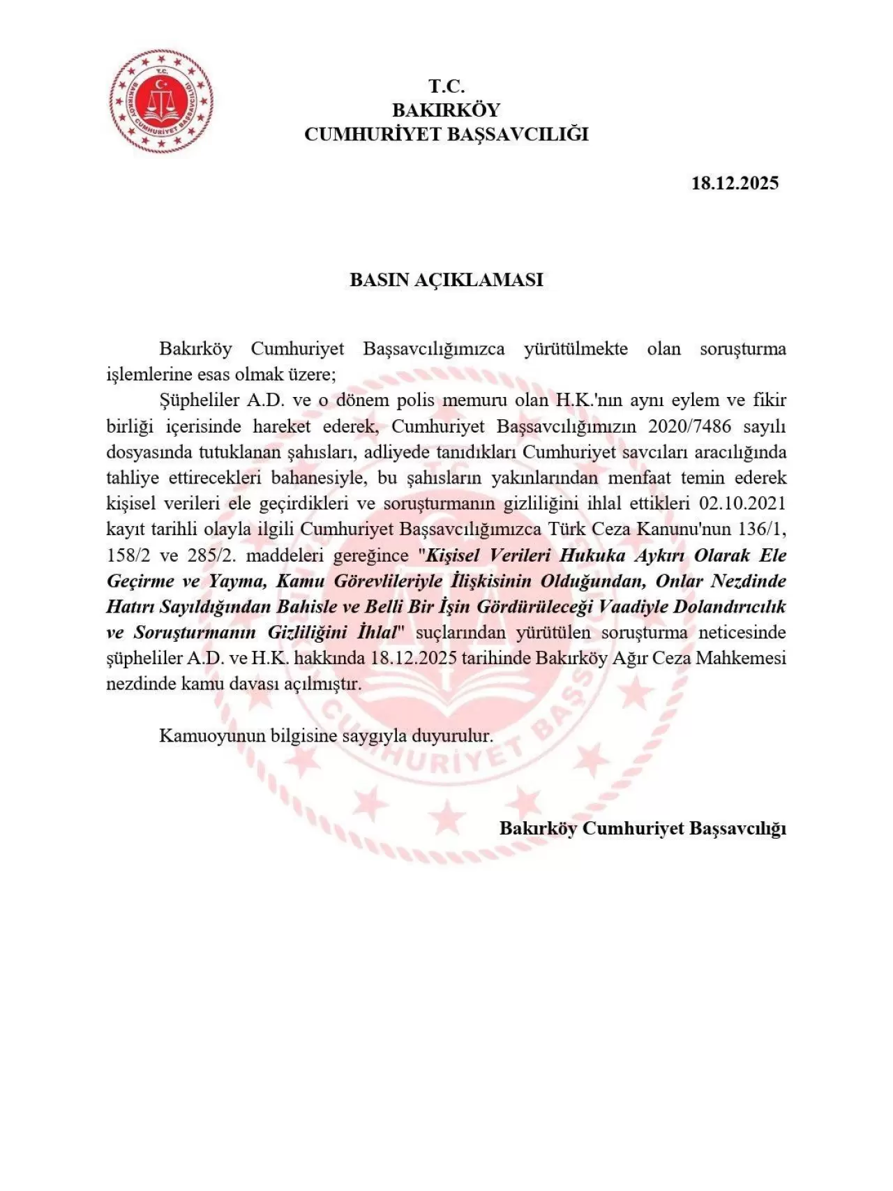 Bakırköy Cumhuriyet Başsavcılığı, tutuklu kişileri savcı bağlantılarıyla tahliye ettirme vaadiyle menfaat sağladıkları ve kişisel verileri hukuka aykırı şekilde ele geçirdikleri iddia edilen biri eski polis iki şüpheli hakkında ağır cezada kamu davası açıldığını duyurdu.