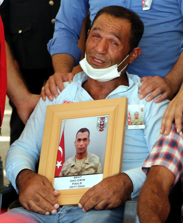 Cenaze töreninde, baba Ahmet Çıkın, güçlükle ayakta durabildi. Ağabeyi İbrahim Çıkın ise şehit kardeşinin Türk bayrağına sarılı tabutunu okşayıp, fotoğrafına bakarak, gözyaşı döktü.