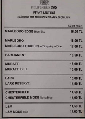 Philip Morris’in amblemini taşıyan listede, şirketin sattığı sigaraların zamlanmış fiyatları yer alıyor.