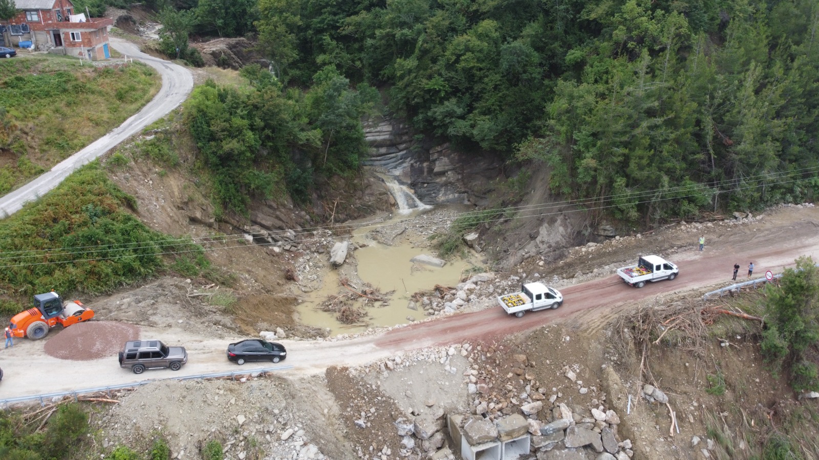 Karayolları ekiplerinin yoğun çabası sonucu, yolun çöken bölümüne 16 büz yerleştirilerek, üzerine toprak serildi.