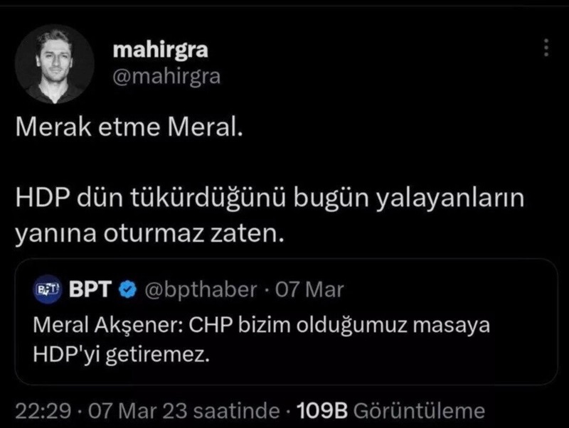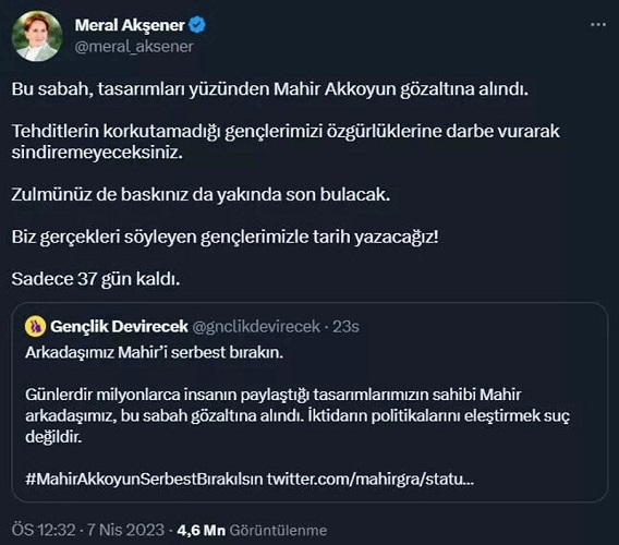 HDP’nin de yer aldığı Yedili Masa’nın ortaklarından İYİ Parti Genel Başkanı Meral Akşener gözaltına alınan Mahir Akkoyun’a “Bu sabah, tasarımları yüzünden Mahir Akkoyun gözaltına alındı. Tehditlerin korkutamadığı gençlerimizi özgürlüklerine darbe vurarak sindiremeyeceksiniz. Zulmünüz de baskınız da yakında son bulacak. Biz gerçekleri söyleyen gençlerimizle tarih yazacağız! Sadece 37 gün kaldı.” paylaşımıyla sahip çıkmıştı.