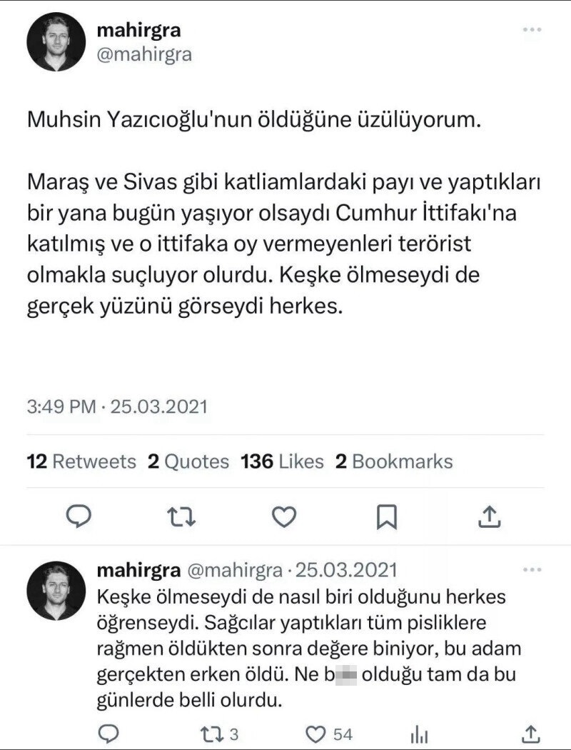 Akkoyun’un ülkücülere hakaret edip, Alparslan Türkeş ve Muhsin Yazıcıoğlu’nu hedef alan paylaşımlar da yaptığı ortaya çıktı.