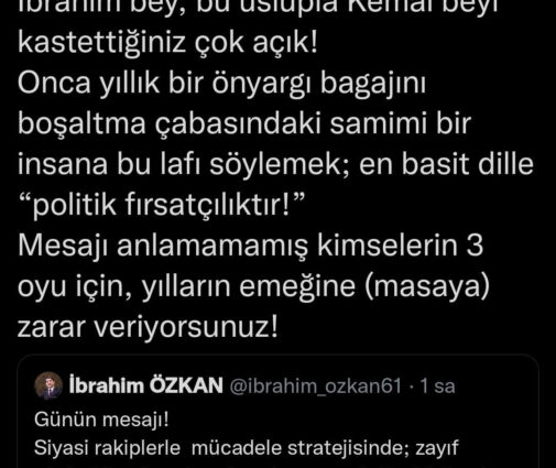 Özkan’ın tweetini alıntılayarak cevap veren Çapan, “İbrahim bey, bu üslupla Kemal beyi kastettiğiniz çok açık! Onca yıllık bir önyargı bagajını boşaltma çabasındaki samimi bir insana bu lafı söylemek; en basit dille “politik fırsatçılıktır!”