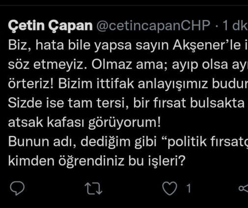 Mesajı anlamamamış kimselerin 3 oyu için, yılların emeğine (masaya) zarar veriyorsunuz!” dedi. Çapan bu paylaşımının altına da “Biz, hata bile yapsa sayın Akşener’le ilgili bir söz etmeyiz. Olmaz ama; ayıp olsa ayıbı örteriz! Bizim ittifak anlayışımız budur!
