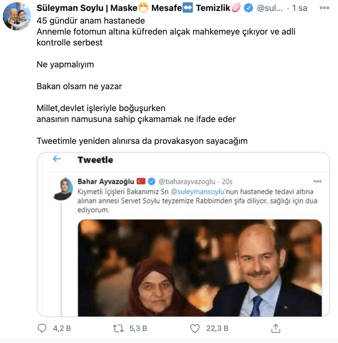 Soylu, konuyla ilgili Twitter hesabından yaptığı açıklamada “45 gündür anam hastanede. Annemle fotomun altına küfreden alçak mahkemeye çıkıyor ve adli kontrolle serbest. Ne yapmalıyım? Bakan olsam ne yazar? Millet, devlet işleriyle boğuşurken anasının namusuna sahip çıkamamak ne ifade eder? Tweetimle yeniden alınırsa da provokasyon sayacağım” dedi.