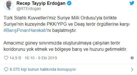 Cumhurbaşkanı Recep Tayyip Erdoğan Suriye operasyonunu başladığını, ”Türk Silahlı Kuvvetleri’miz Suriye Milli Ordusu’yla birlikte Suriye’nin kuzeyinde PKK/YPG ve Deaş terör örgütlerine karşı #BarışPınarıHarekatı’nı başlatmıştır.