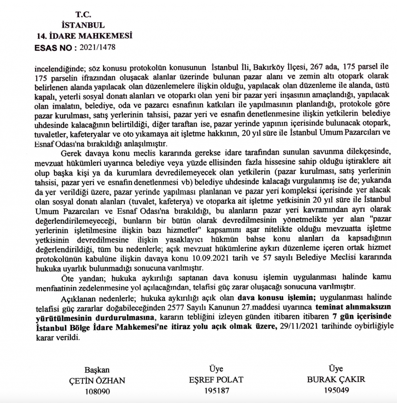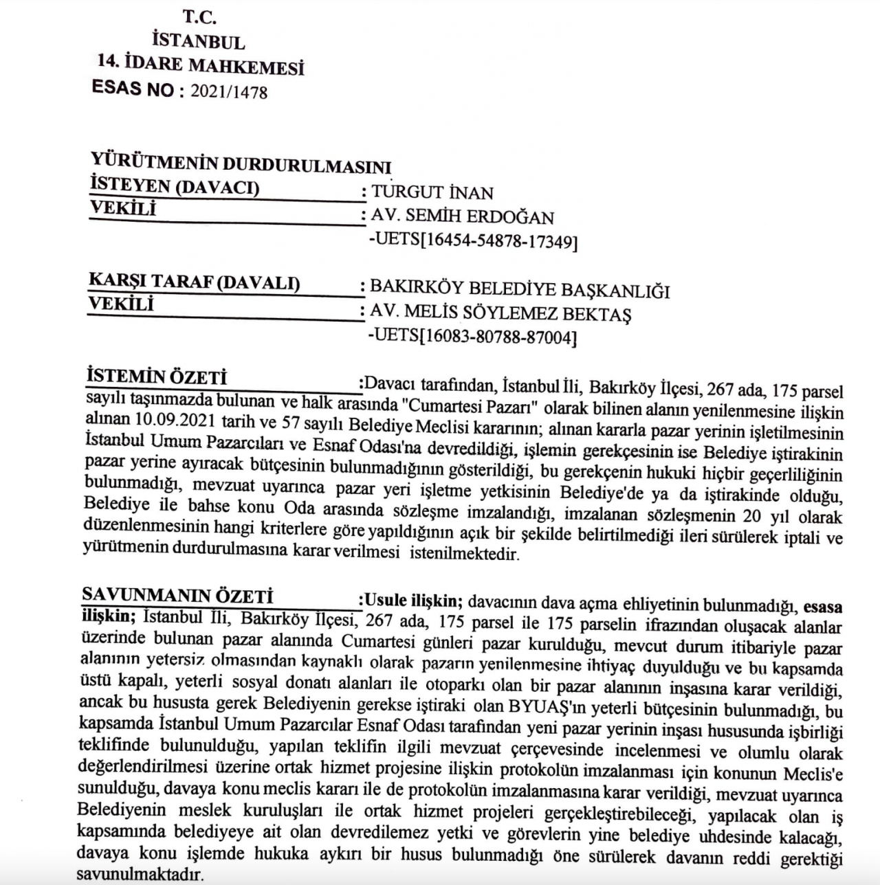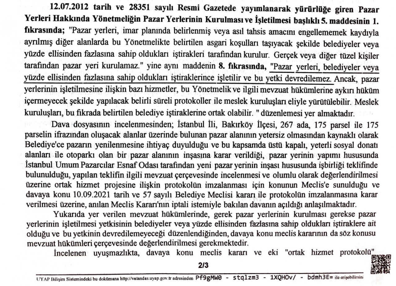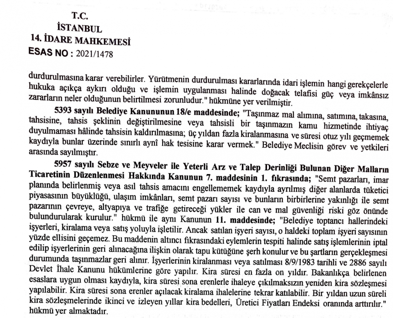 CHP’li belediyenin ve iştirakinin kasasında pazar yerine ayıracak bütçe olmaması gerekçesiyle ”Cumartesi pazarı” olarak bilinen alanın yenilenmesi için İstanbul Umum Pazarcıları ve Esnaf Odası’na 20 yıllığına devredildiğine dair sözleşme imzalandığını kaydeden MHP Bakırköy ilçe teşkilatı, düzenlemenin hangi kriterlere göre yapıldığının açık bir şekilde belirtilmediğini ileri sürerek, söz konusu anlaşmanın iptali ve yürütmenin durdurulmasına karar verilmesi için yargıya başvurdu.