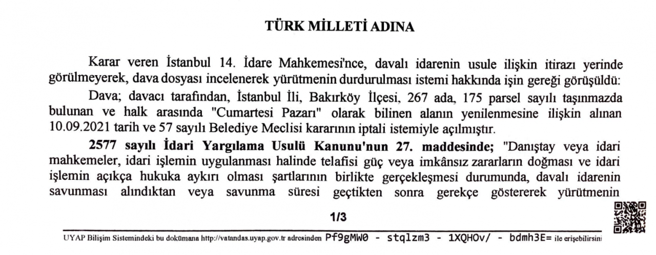 İstanbul 14. İdare Mahkemesinde görülen davada karar açıklandı. Mahkeme, MHP Bakırköy İlçe Teşkilatının itirazını haklı bularak, CHP’li belediyenin yaptığı usulsüzlüklerin ardından söz konusu proje için yürütmeyi durdurma kararı verdi.