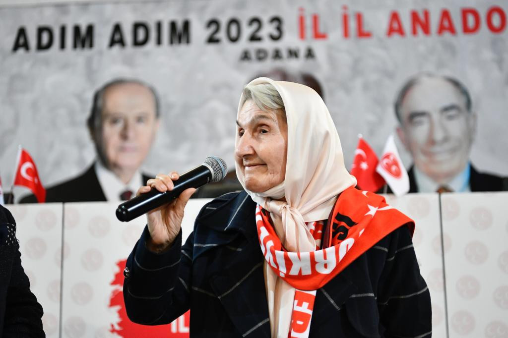 Başkan Uludağ ise konuşmasında “Azime Annemiz ilk kadın kolları başkanımızdır. Kendisi ilerleyen yaşına rağmen bugün davasına sadakati, azmi ve inancı ile hepimize örnek teşkil etmektedir. Liderimiz Sayın Devlet Bahçeli Beyefendinin talimatları ile “Adım Adım 2023, İl İl Anadolu” programı kapsamında Adana’da gerçekleştirilen programın Sarıçam bölümünde “Güçlü Türkiye-Kadın ve Gençlik” programına katılarak bizlere şeref verdi. Kendisine teşekkür ediyor Cenabı Allah’tan sağlıklı ve uzun ömürler diliyorum.”