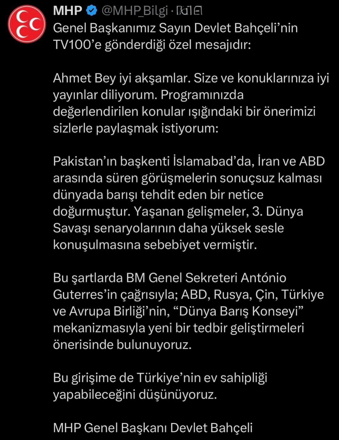 Bahçeli, mesajında İran ve ABD arasındaki görüşmelerin sonuçsuz kalmasının uluslararası barış açısından ciddi riskler oluşturduğunu ifade etti. Bu durumun, “3. Dünya Savaşı senaryolarının daha yüksek sesle konuşulmasına” yol açtığını dile getirdi.