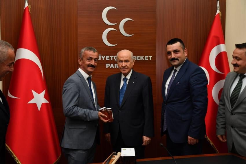 MHP’den 2. kez seçilerek Derepazarı Belediyesi Meclis Üyesi olan Hakkı Erdoğan ise Bahçeli’ye her derde deva olarak bilinen ve kilosu bin lira olan Anzer Balı hediye etti.