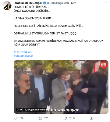Melih Gökçek, ”Olmadı Lütfü Türkkan. Önce soyadını değiştir. Kadına sövemezsib bir. Hele hele şehit ailesine asla sövemezsin iki. Derhal milletvekilliğinden istifa et üç. Sayın Akşener bu adamı partiden atmazsan siyasi faturası çok ağır olur dört.” dedi.