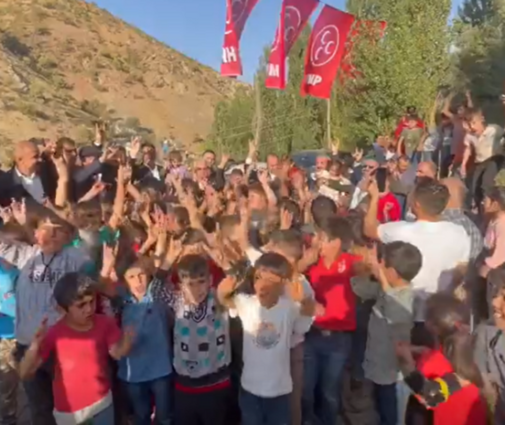 MHP Genel Sekreter Yardımcısı Tamer Osmanağaoğlu ve Hakkari il Başkanı Mehmet Beşir Tatar’ı köy sohbetleri programı kapsamında gittikleri Şemdinli Üzümkıran köyünde çocuklar karşıladı.