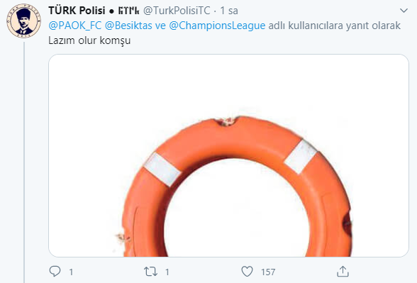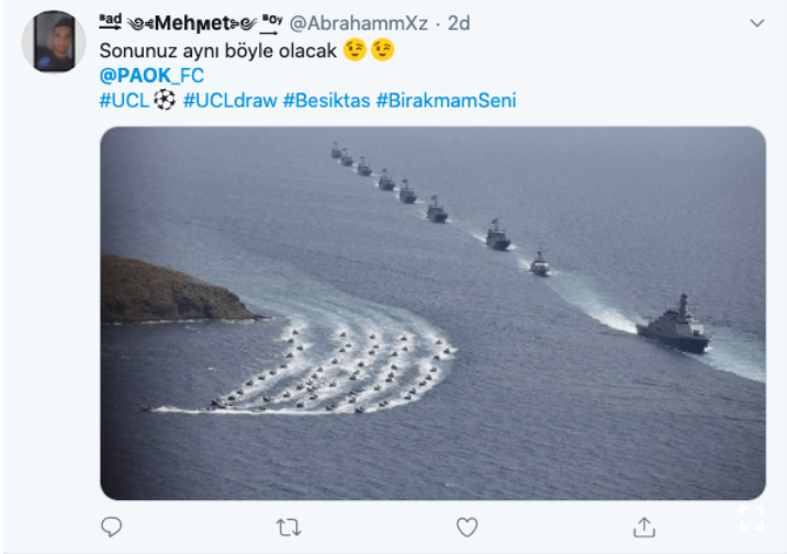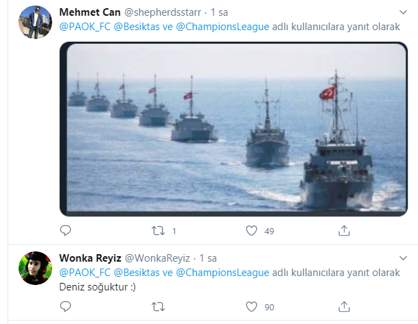 Beşiktaş-Paok eşleşmesi sosyal medyanın gündemine oturdu. Türkiye’nin Yunanistan ile Doğu Akdeniz ve Ege’de yaşadığı gerilime göndermeler yapan siyah beyazlı taraftarlardan bomba yorumlar geldi.