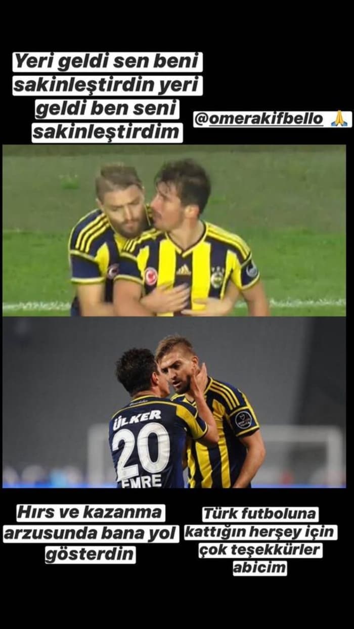 Tecrübeli oyuncu, eski takım arkadaşına duygusal bir mesaj yollarken, “Yeri geldi sen beni sakinleştirdin, yeri geldi, ben seni sakinleştirdim. Hırs ve kazanma arzusunda bana yol gösterdin. Türk futboluna kattığın her şey için çok teşekkürler abicim.” ifadelerini kullandı.