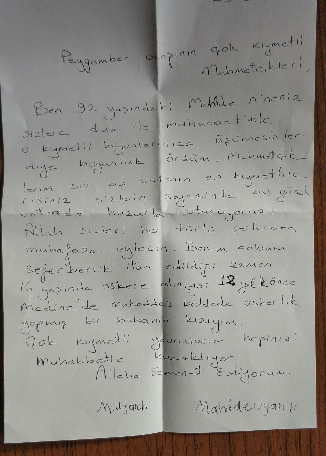 Adapazarı ilçesi Orta Mahalle’de yaşayan 92 yaşındaki Mahide Uyanık, Mehmetçik için kendi elleriyle onlarca atkı ördü. Askeri yetkililere teslim edilen atkılar, yaşlı kadının memleketinden yüzlerce kilometre uzakta Şırnak’taki bir askeri birliğe ulaştırıldı. Yetkililer tarafından düzenlenen törende erbaş ve erlere verilen atkıların arasından bir de duygulandıran bir mektup çıktı. Mektubun askerlere okunduğu anlar video kaydına alındı. Asker sevdalısı yaşlı kadın mektubunda, “Peygamber ocağının çok kıymetli Mehmetçikleri; ben 92 yaşındaki Mahide nineniz. Sizlere dualarımla muhabbetimle o kıymetli boyunlarınıza üşümesinler diye boyunluk ördüm. Mehmetçiklerim, siz bu vatanın en kıymetlilerisiniz. Sizlerin sayesinde bu güzel vatanda huzurla oturuyoruz. Allah sizleri her türlü şerlerden muhafaza eylesin. Benim babam, seferberlik ilan edildiği zaman 16 yaşında askere alınıyor. 12 yıl Medine’de mukaddes beldede askerlik yapmış bir babanın kızıyım. Çok kıymetli yavrularım; hepinizi muhabbetle kucaklıyor, Allaha emanet ediyorum” ifadelerine yer verdi.
