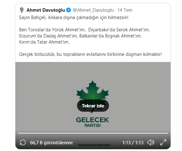 Davutoğlu yaptığı paylaşımda, ‘Sayın Bahçeli, Ankara dışına çıkmadığın için bilmezsin! Ben Toroslar’da Yörük Ahmet’im, Diyarbakır’da Serok Ahmet’im, Erzurum’da Dadaş Ahmet’im, Balkanlar’da Boşnak Ahmet’im, Kırım’da Tatar Ahmet’im. Gerçek bölücülük, bu toprakların evlatlarını birbirine düşman kılmaktır!” şeklinde asılsız bir iddiada bulunmuştu.