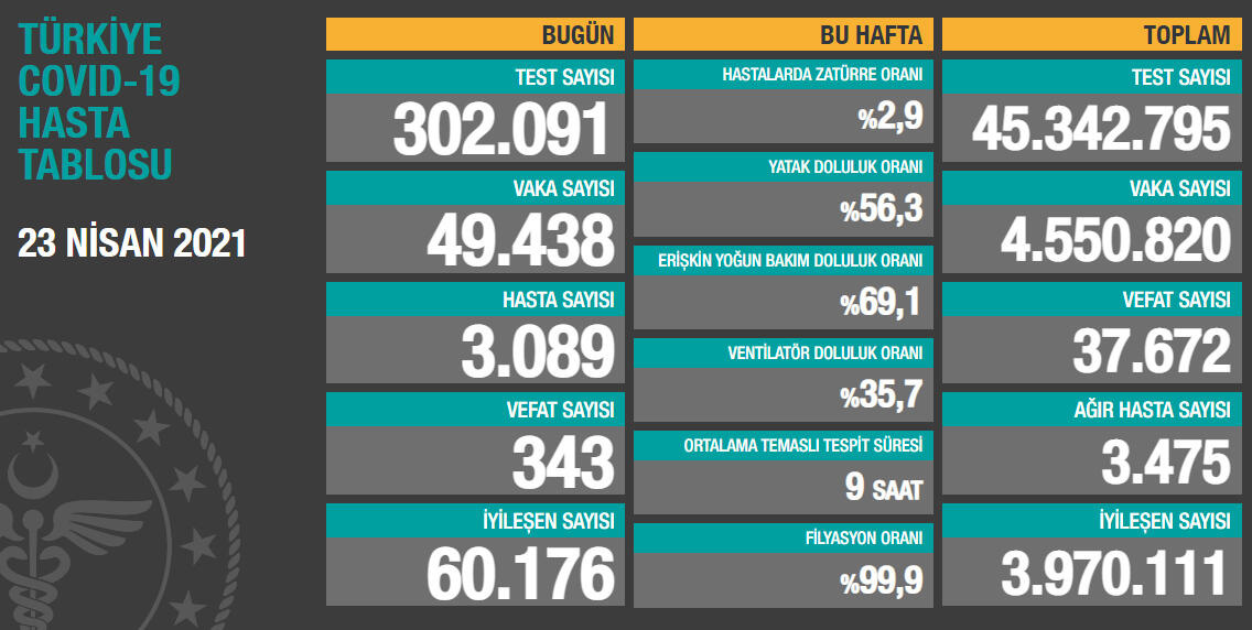 302 bin 91 Kovid-19 testi yapıldı, 49 bin 438 kişinin testi pozitif çıktı, 343 kişi hayatını kaybetti.