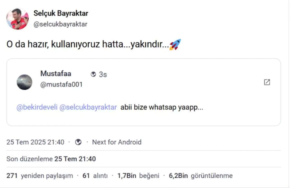 Bir kullanıcının “Abi bize Whatsapp yap” mesajını alıntılayan Bayraktar, “O da hazır, kullanıyoruz hatta…yakındır…” ifadelerini kullandı.