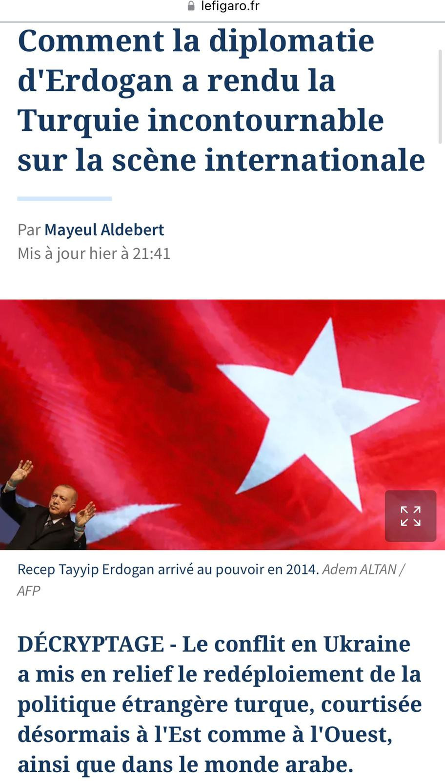 Fransa’da yayınlanan Le Figaro gazetesinde “Erdoğan’ın diplomasisi Türkiye’yi nasıl uluslararası sahnede vazgeçilmez konuma getirdi?” başlıklı bir yazı yayınlandı. Yazıda, Ukrayna’daki ihtilafın hem Doğu’da hem Batı’da hem de Arap dünyasında övülen Türk dış politikasının yeniden konumlandırılmasını öne çıkardığı ifade edildi.